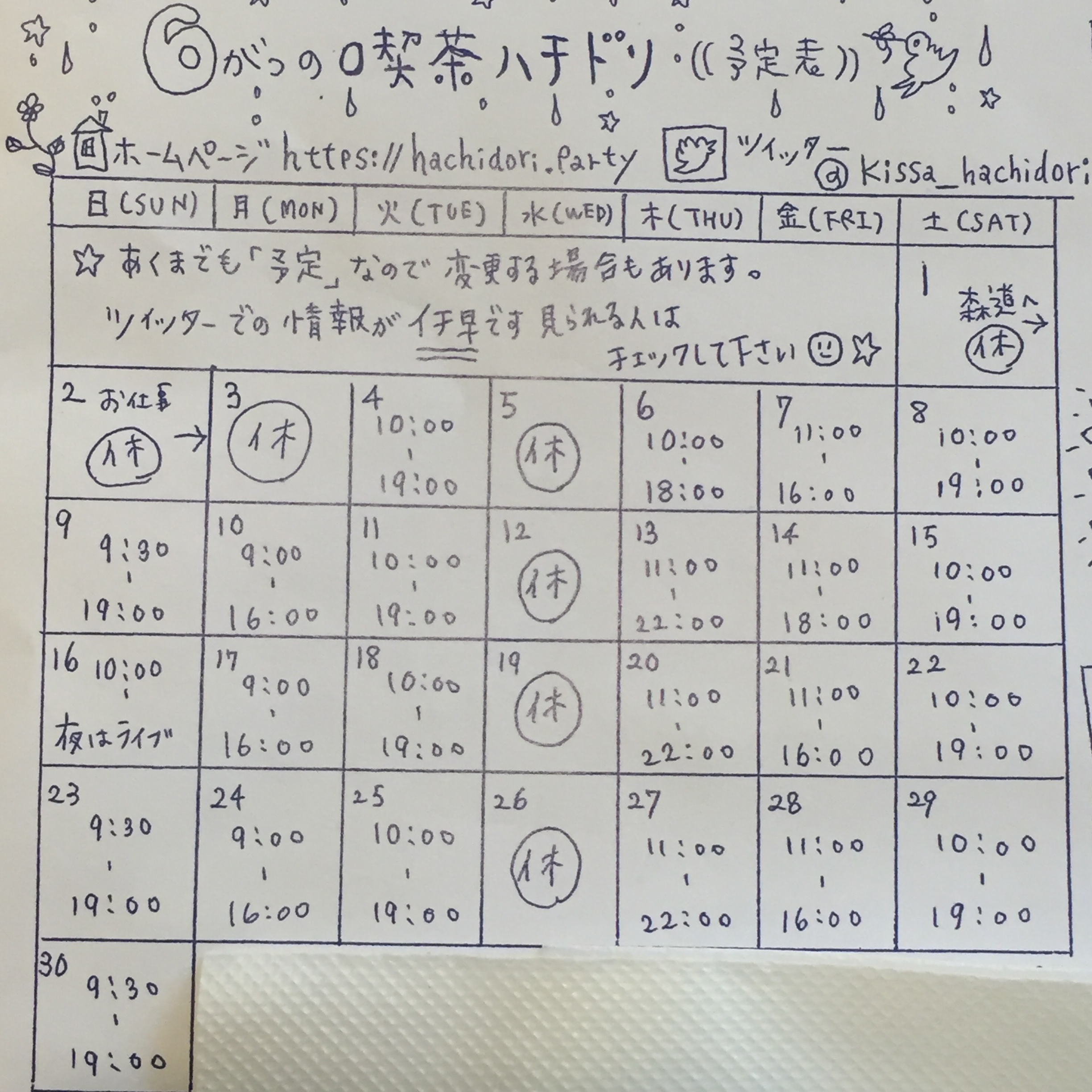 その他変更ある場合は、ツイッターにていち早くお知らせさていますので、@kissa_hachidori をご覧ください◯