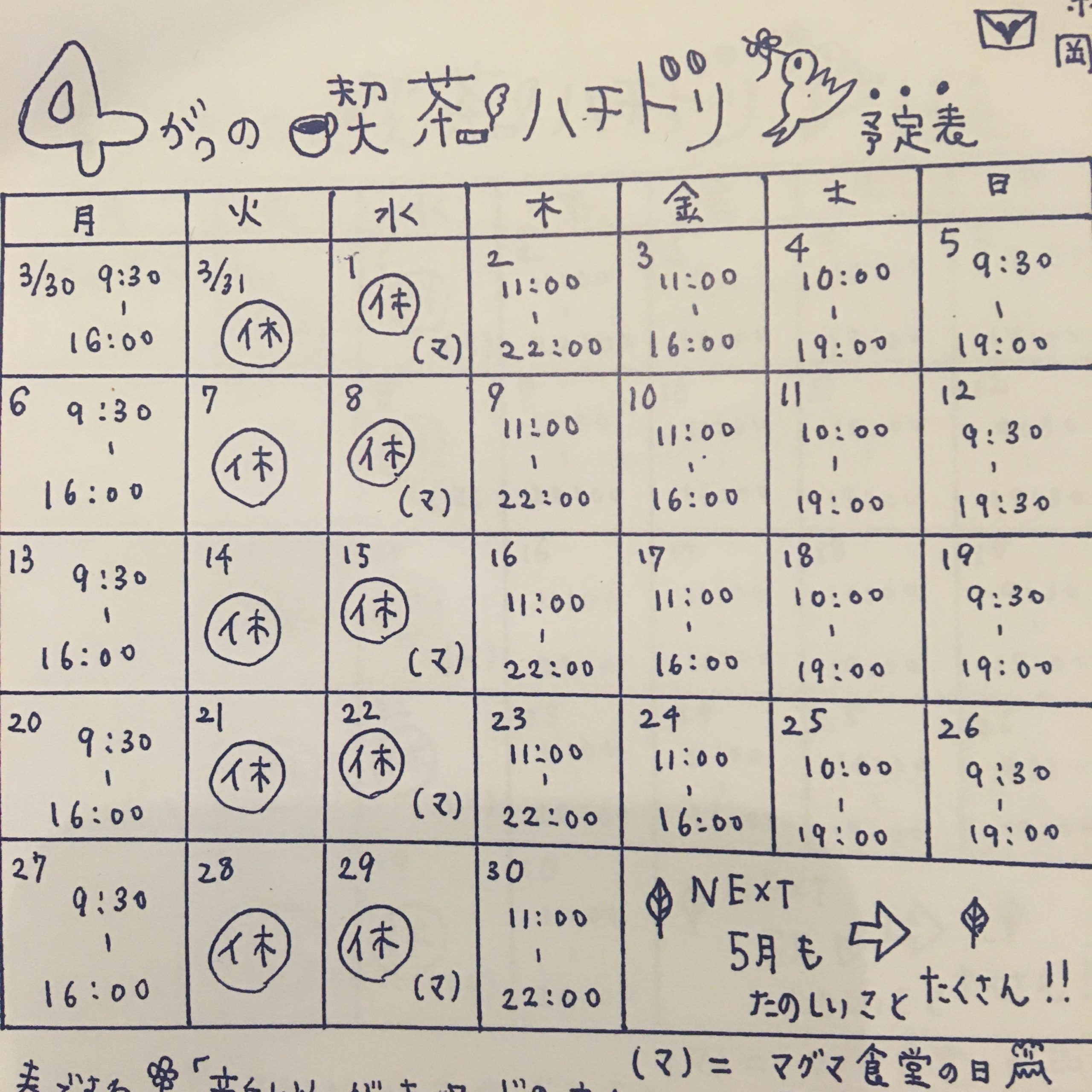 今月からまた通常営業で、喫茶ハチドリひ火曜水曜日はおやすみです