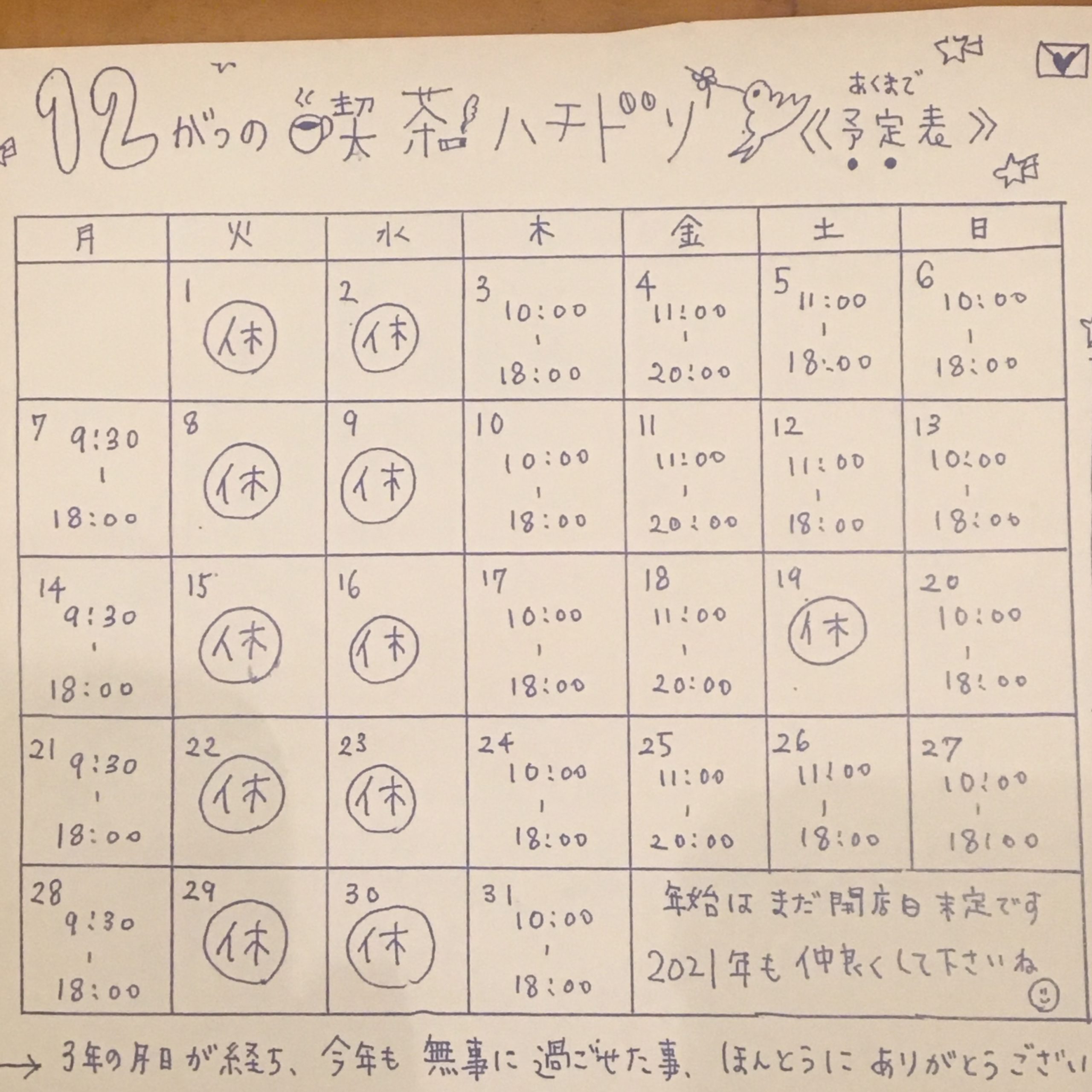 来年も平和で穏やかな時間が流れ続ける場所として、ここに喫茶ハチドリがありますように。